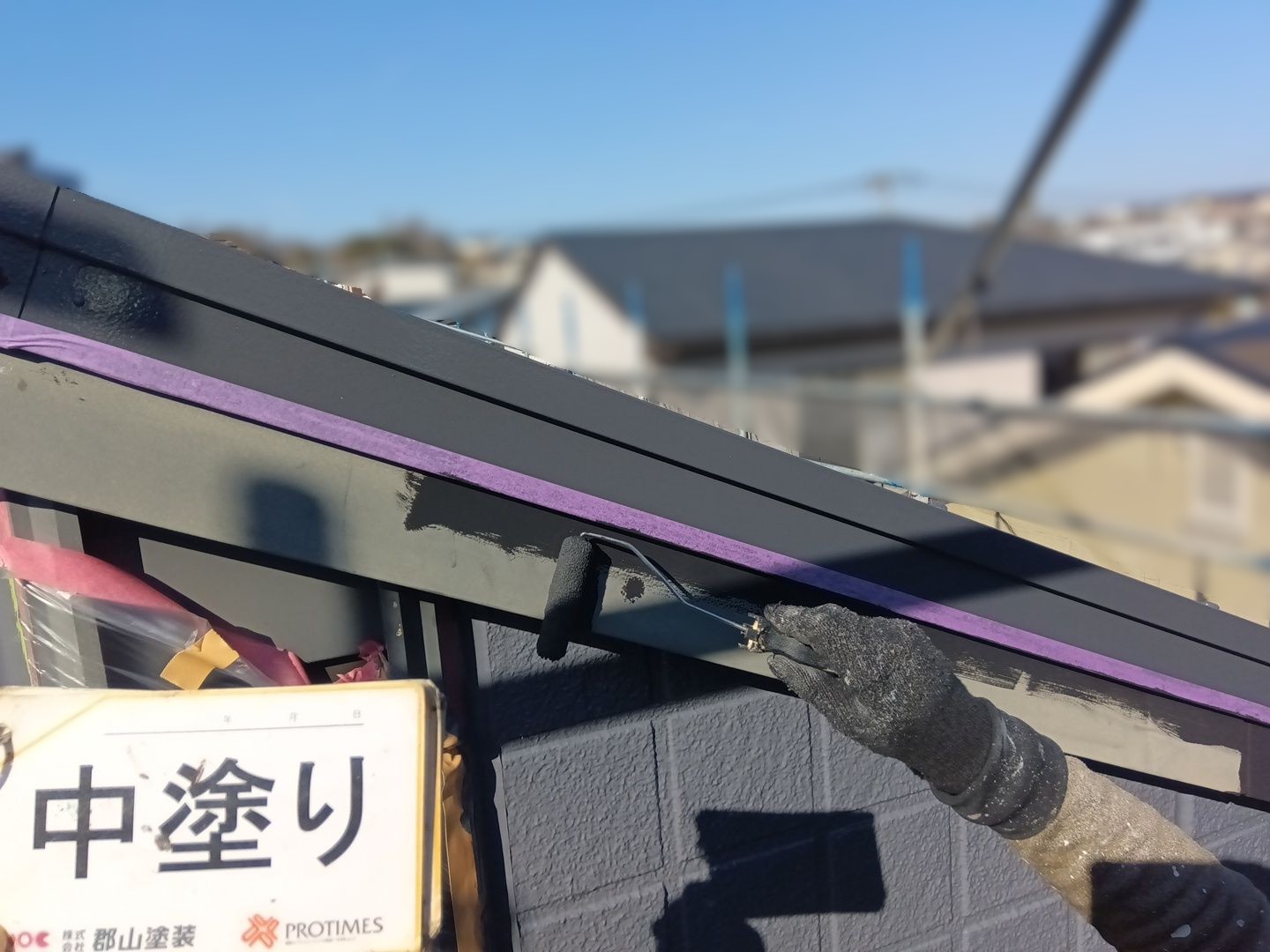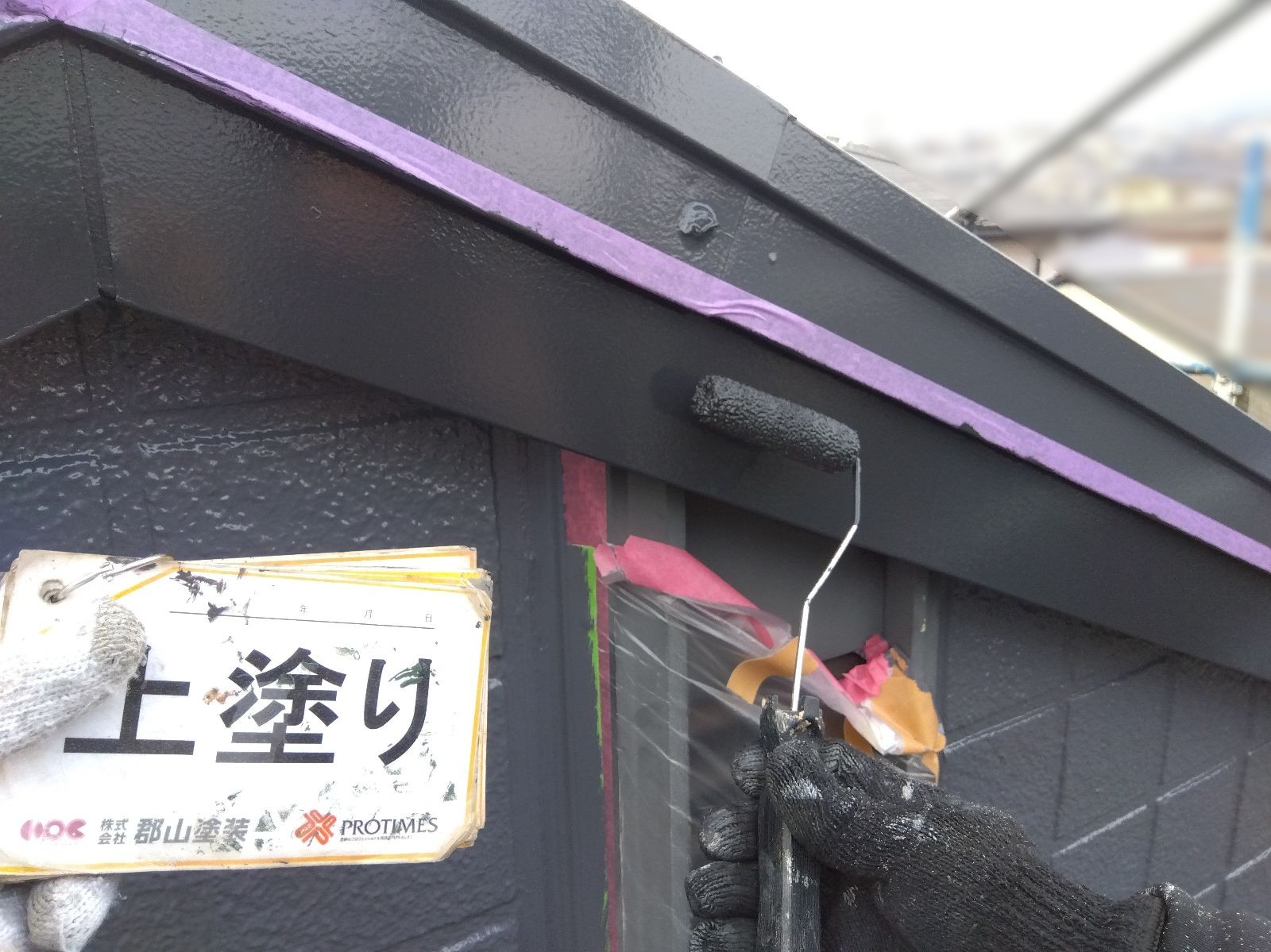 破風 上塗り 付帯部を黒系の塗料で塗装することで、引き締まった印象に◎