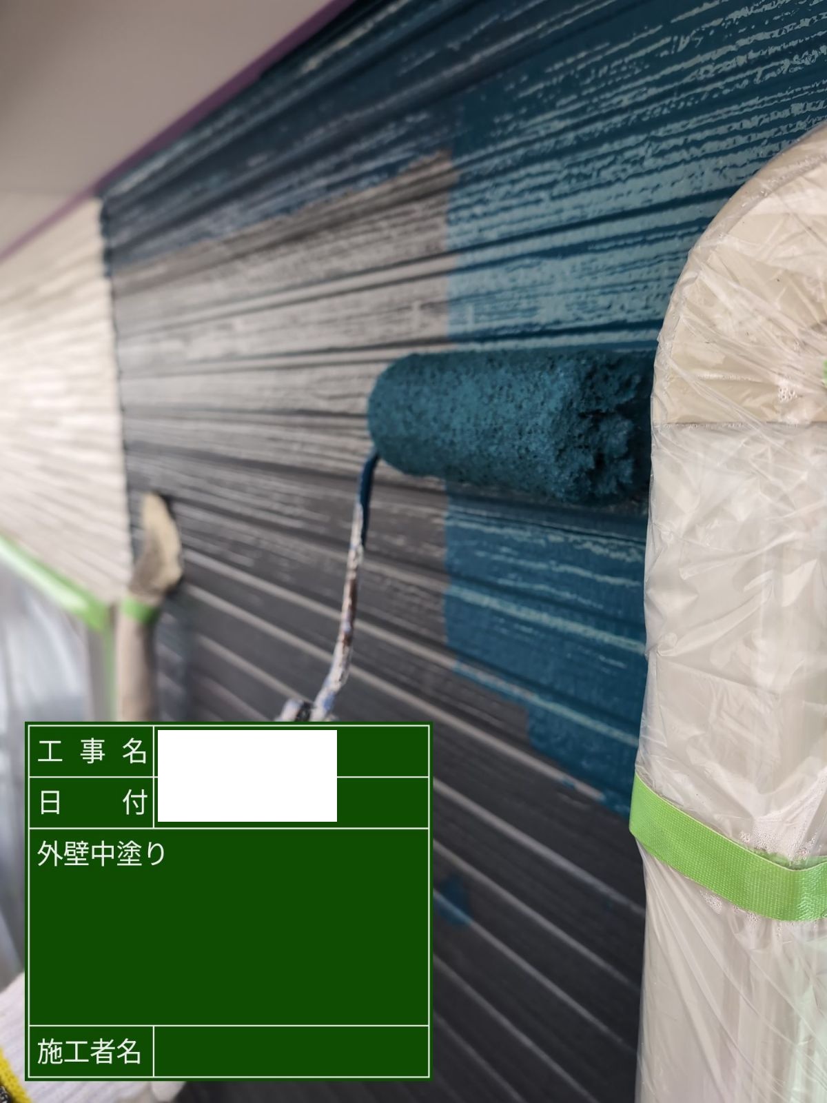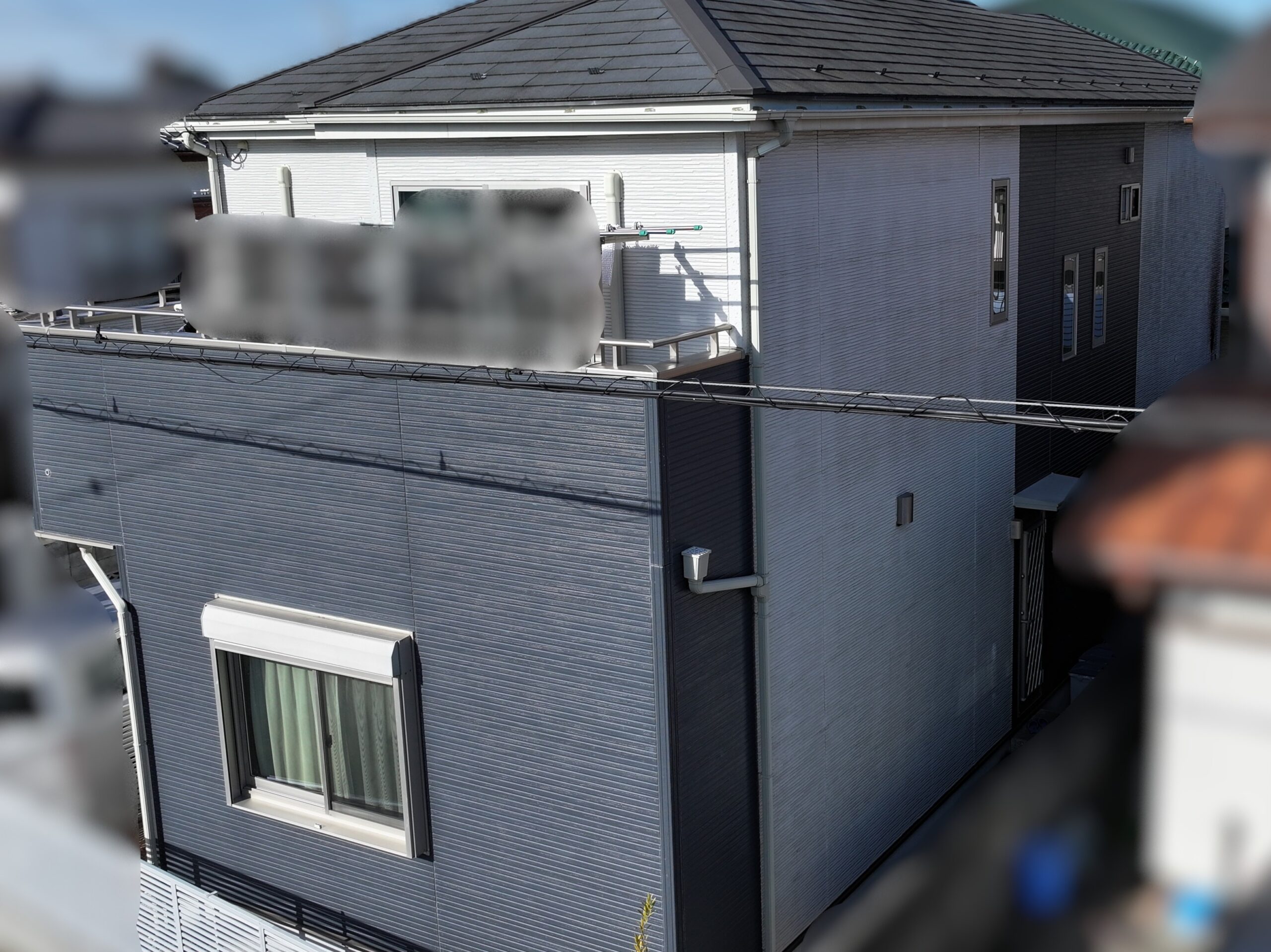 シャッターボックス 上塗り 外壁が白色の箇所は白、外壁が青色の箇所は青色を選定することで、まとまりのある印象になりました。