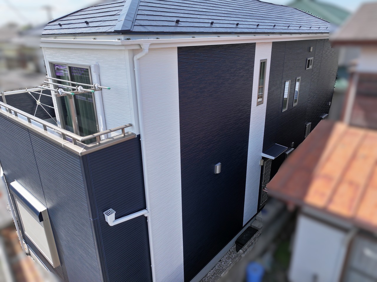 外壁塗装 上塗り 濃い青色で、白と青のコントラストが映える仕上がりに。