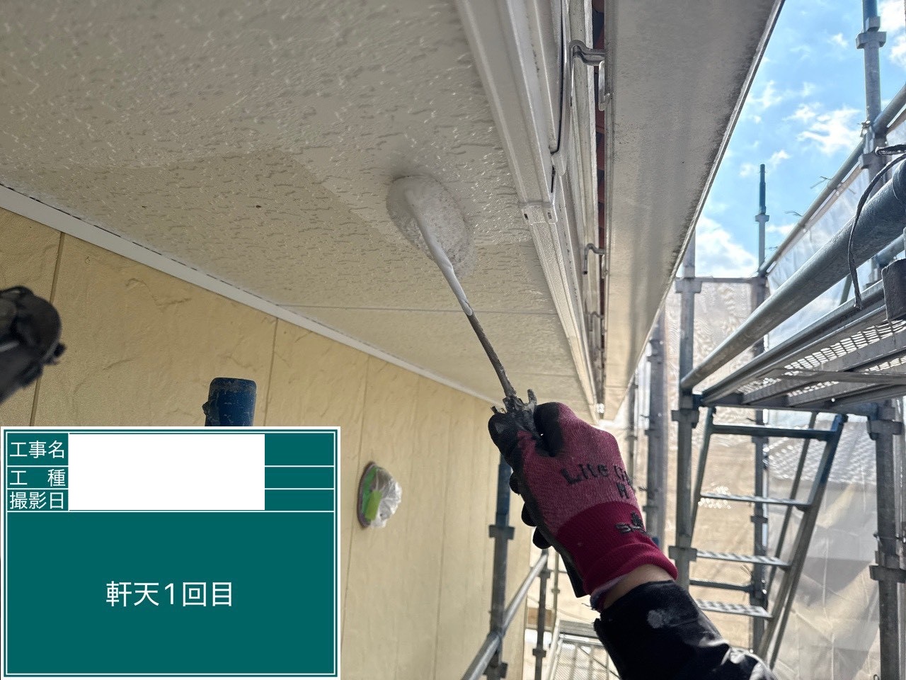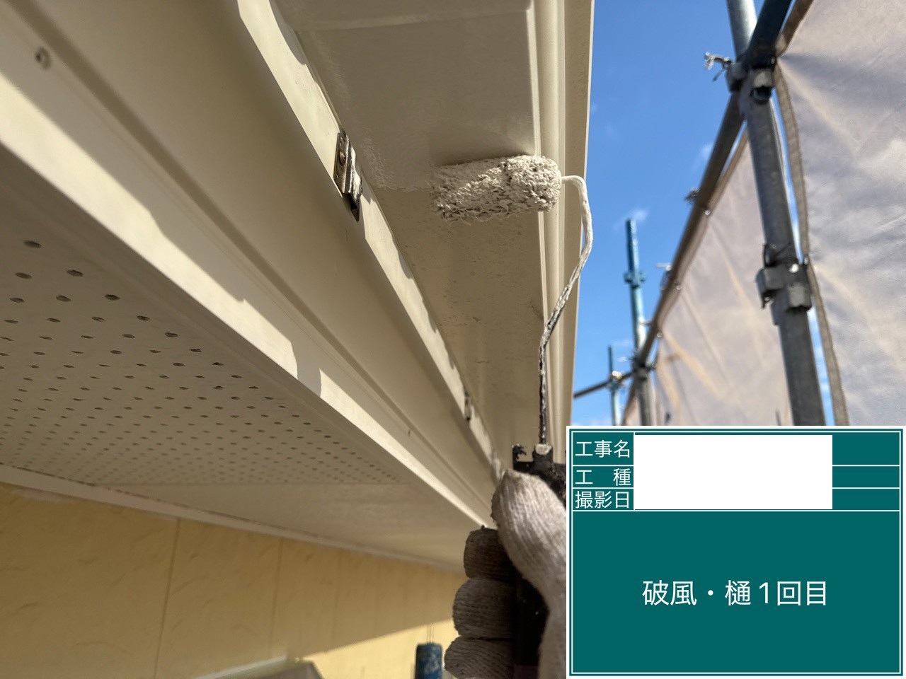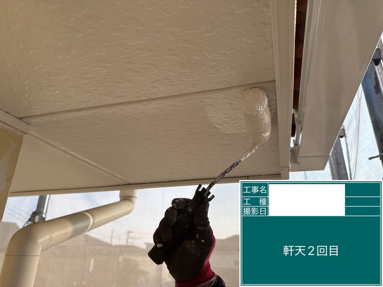 軒天 中塗り 劣化はあまり見られませんでしたが、外壁とともに塗装することで統一感のある印象に!