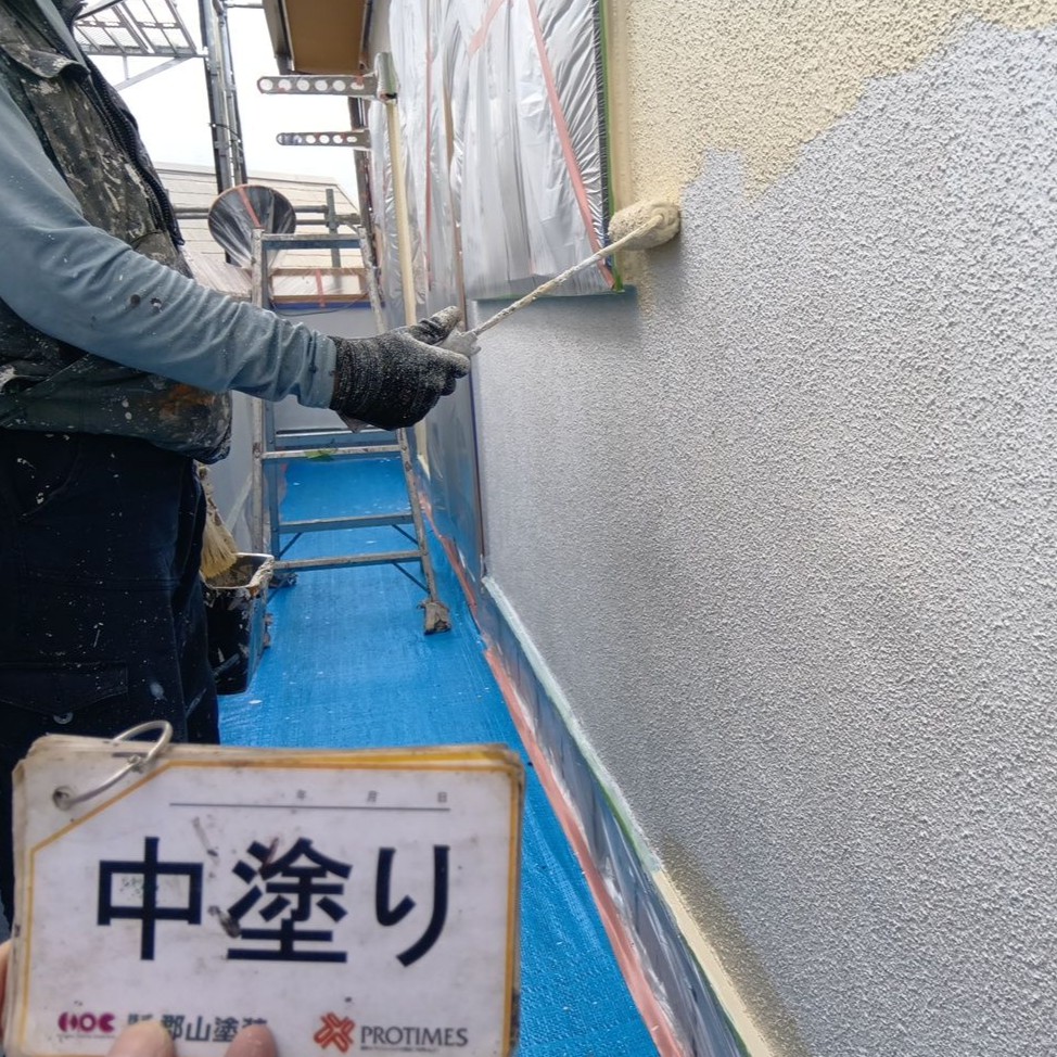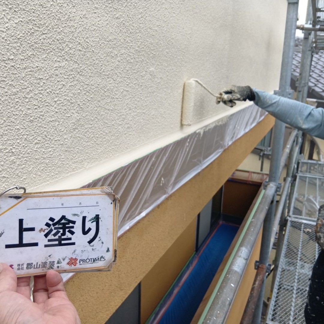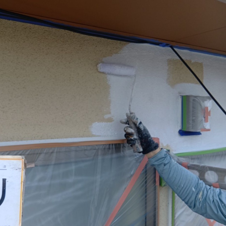 • 上塗りです。施工前には、ヘアークラックと呼ばれる0.3ミリ以下のひび割れが発生していました。ひび割れ部分から雨水が侵入してしまうと、雨漏りに繋がる恐れがあります。小さなクラックがある場合でも、早めに補修を行うことが建物を長持ちさせるポイントになります。